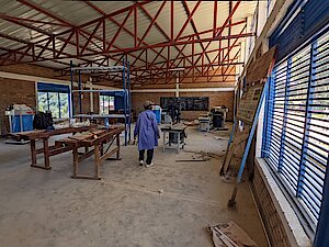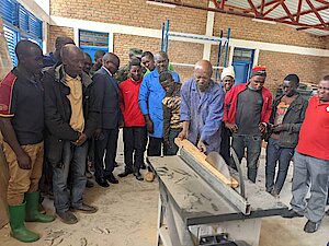Umuyobozi w’Akarere ka Ngororero, Nkusi Christophe ari kumwe n’itsinda yari ayoboye yafunguye ku mugararo ishuri ry’imyuga rya Runayu ryigisha ubudozi n’ububaji mu Murenge wa Muhanda.