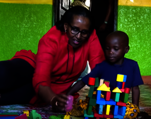 Mu ruzinduko rwe Madamu Jeannette Kagame yabanje gusura irerero ry'abana bato rifasha imiryango yagizweho ingaruka n'ibiza mu kubungabunga ubuzima bwabo. Abaturage bishimiye uburyo batatareranywe, ubuyobozi bwiza bubitayeho babigaragariza mu imbamutima zabo.