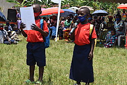 Abana bahawe impamyabumenyi basomeye ababyeyi ibitabo bavuga n'imivuga ishimira umufatanyabikorwa Save the Children n'ababyeyi babo.