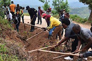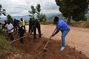 Umuyobozi w'Akarere Wungirije Ushinzwe Iterambere ry'Imibereho Myiza y'Abaturage Madamu MUKUNDUHIRWE Benjamine we yifatanyije n'Abaturage n'Umurenge wa Hindiro ahacukuwe imirwanyasuri.