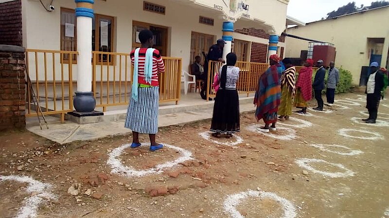 Kuri uyu wa kabiri tariki 21/04/2020 rwakoze umuganda wo gushushanya ibimenyetso bifasha abaturage guhanahana intera yagenwe hagati y'umuntu n'undi ahatangirwa service ariho: